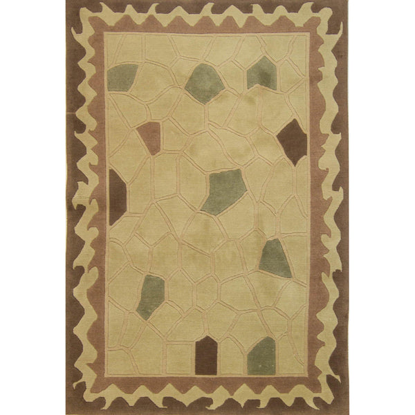 This rug is 100% wool, hand-knotted, and extremely hard wearing. The design features irregular and random shapes, on a cream field and framed by a border. This rug also features irregular shapes. Colours are earthy and muted.