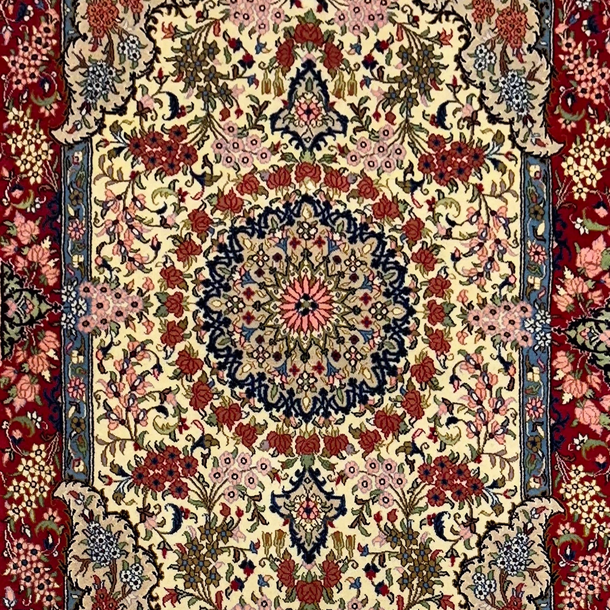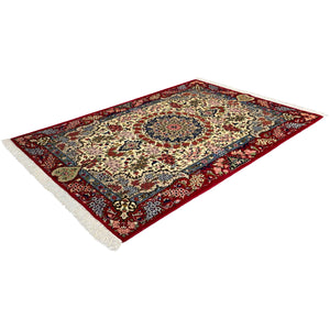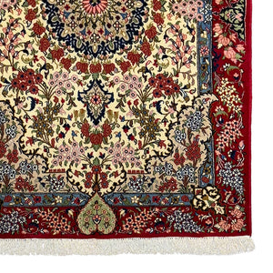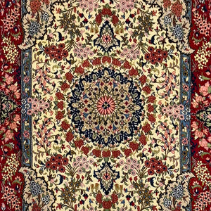 Handmade in Shahreza, this refined Persian rug is woven from handspun sheep’s wool and showcases the quiet elegance the region is known for. The soft cream field is centered by a finely articulated floral medallion, surrounded by flowing vines, palmettes, and delicate arabesques arranged in perfect symmetry. A rich red border, filled with dense floral motifs and framed by subtle blue and ivory guard borders, brings depth and definition to the design. Accents of navy, soft pink, green, and muted gold add warmth and balance, resulting in a timeless piece that bridges classic Persian design with understated sophistication.