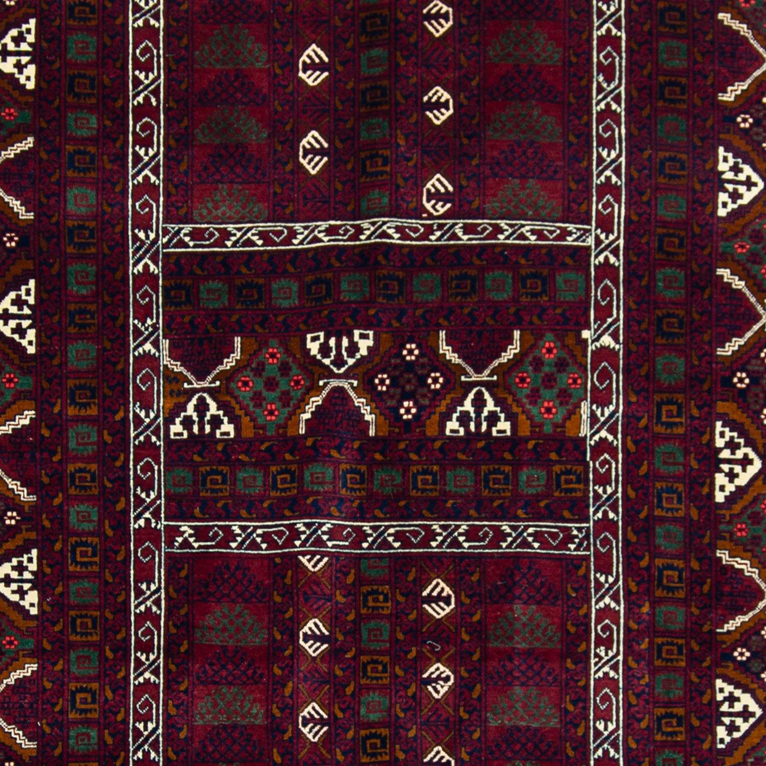 This is a Hatchloo Afghan Turkman rug. Use of two strong geometric squares that represent windows. These rugs were originally made for entrances of tents for nomadic people. Sturdily hand-knotted in wool by tribal people, originally were part of the well-known Turkman tribe. Made from hand spun wool and natural dyes.