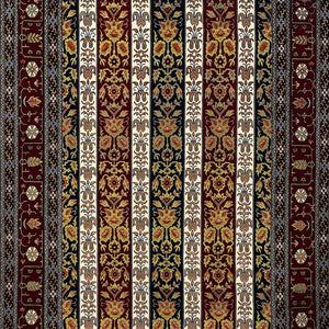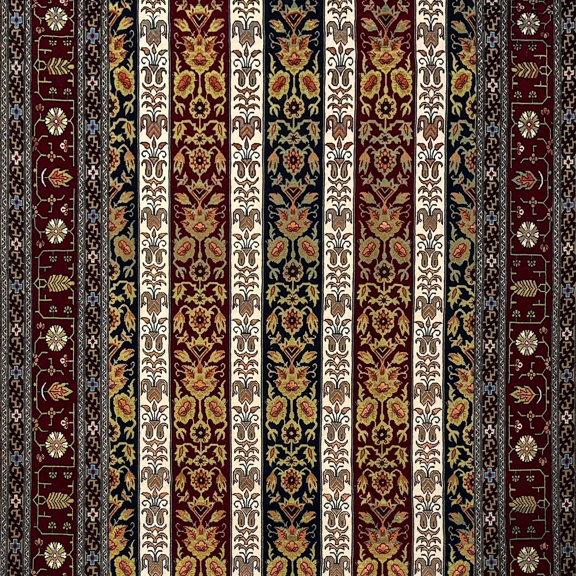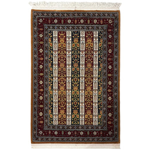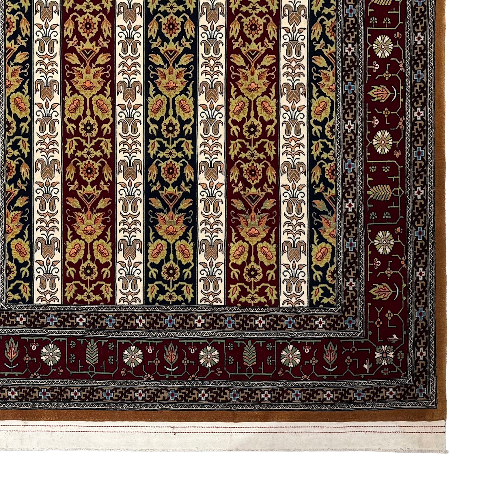 A finely hand-knotted Persian Qum (Ghom) rug crafted from high-quality lamb’s wool with natural silk highlights in the pile. The rug features a distinctive vertical panel design filled with intricate floral motifs, beautifully framed by richly detailed borders. A harmonious palette of camel, pomegranate, ivory, sage, and navy tones creates a warm yet elegant presence suited to both classic and contemporary interiors.