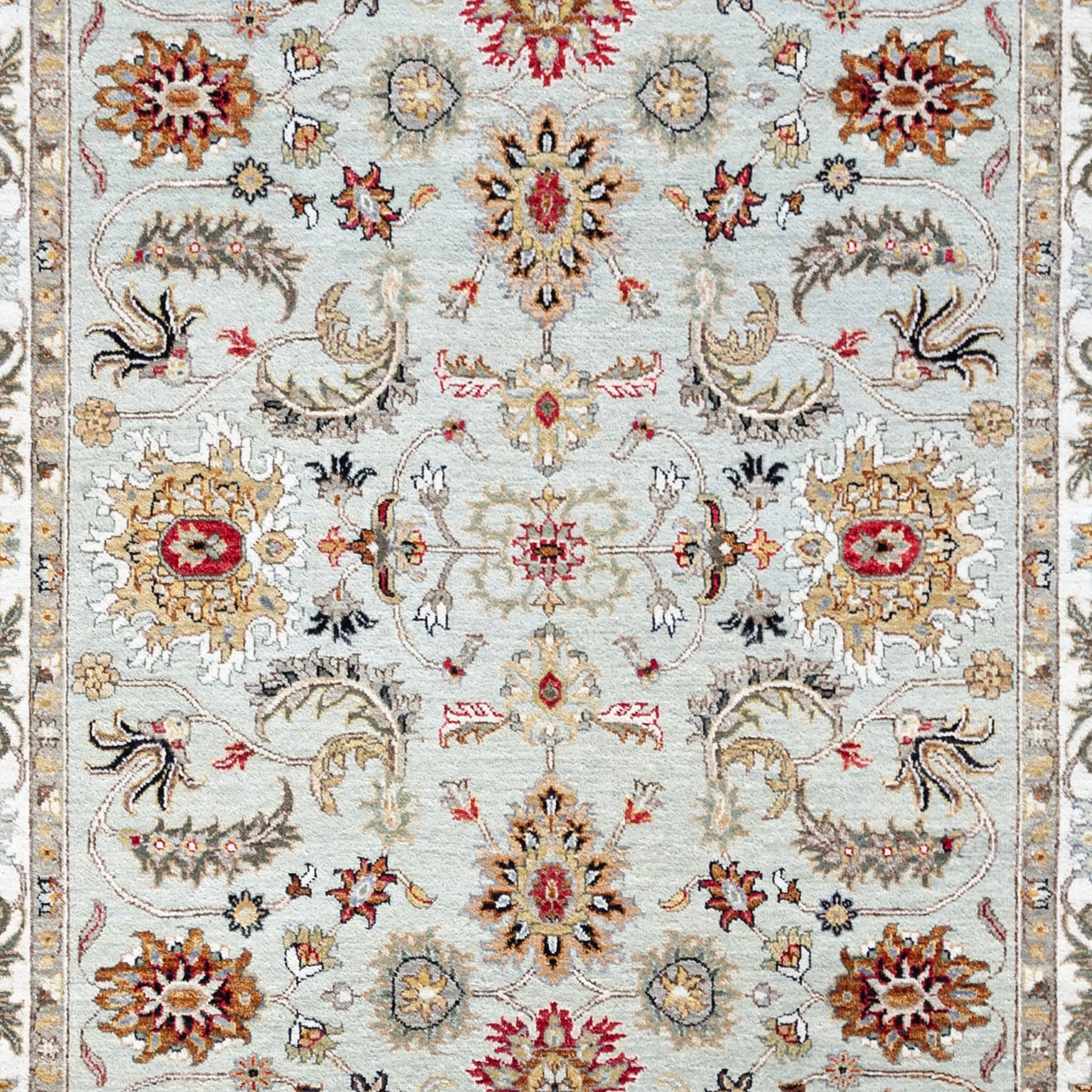 This beautiful hand-knotted wool rug brings a sense of warmth, character and timeless style to any room. It features a soft pale green background paired with detailed floral patterns in rust red, gold, olive green, beige and black, a classic design that feels both traditional and effortlessly elegant.