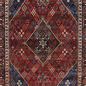 The design features a bold diamond-shaped central medallion, framed by a field of repeating lozenge motifs filled with the iconic Joushaghan floral rosettes, symbols of balance, renewal and prosperity. Its multiple borders, decorated with stylized flowers and angular motifs, enhance the symmetry and elegance of the piece.