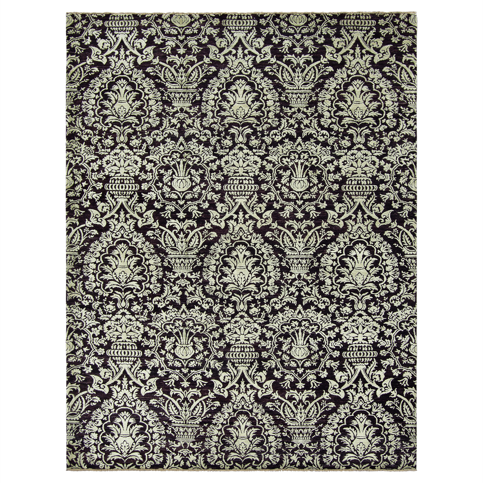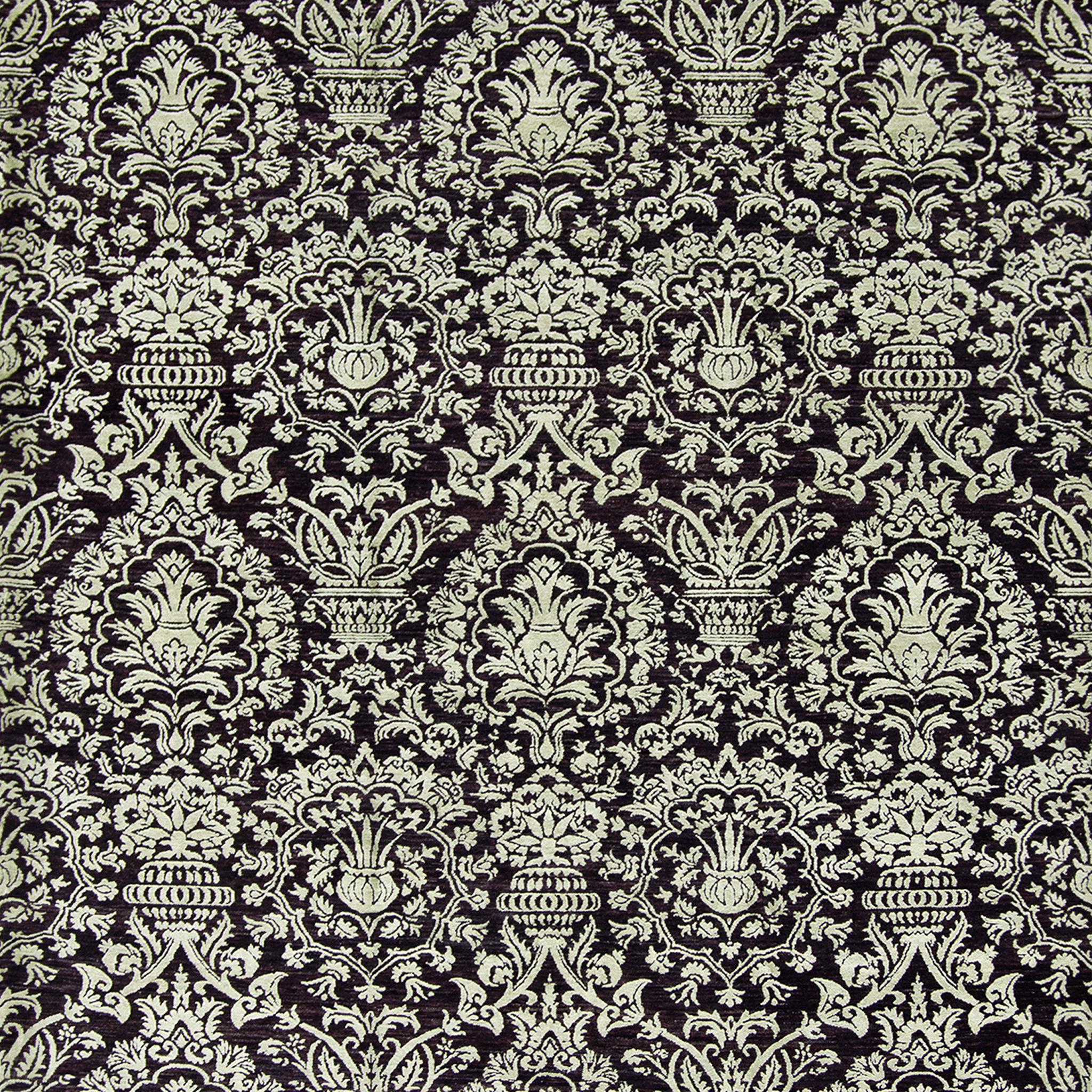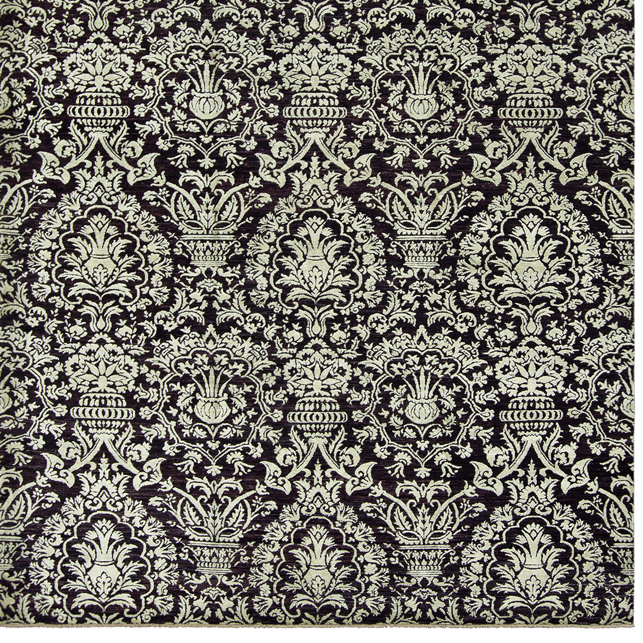 This modern, hand-knotted wool and silk pile rug references the Damask patterns. Typical of the Byzantine and Middle Eastern weaving centers in the early middle ages. The pattern is enlarged, and the black/brown and green colour gives the design a contemporary twist.