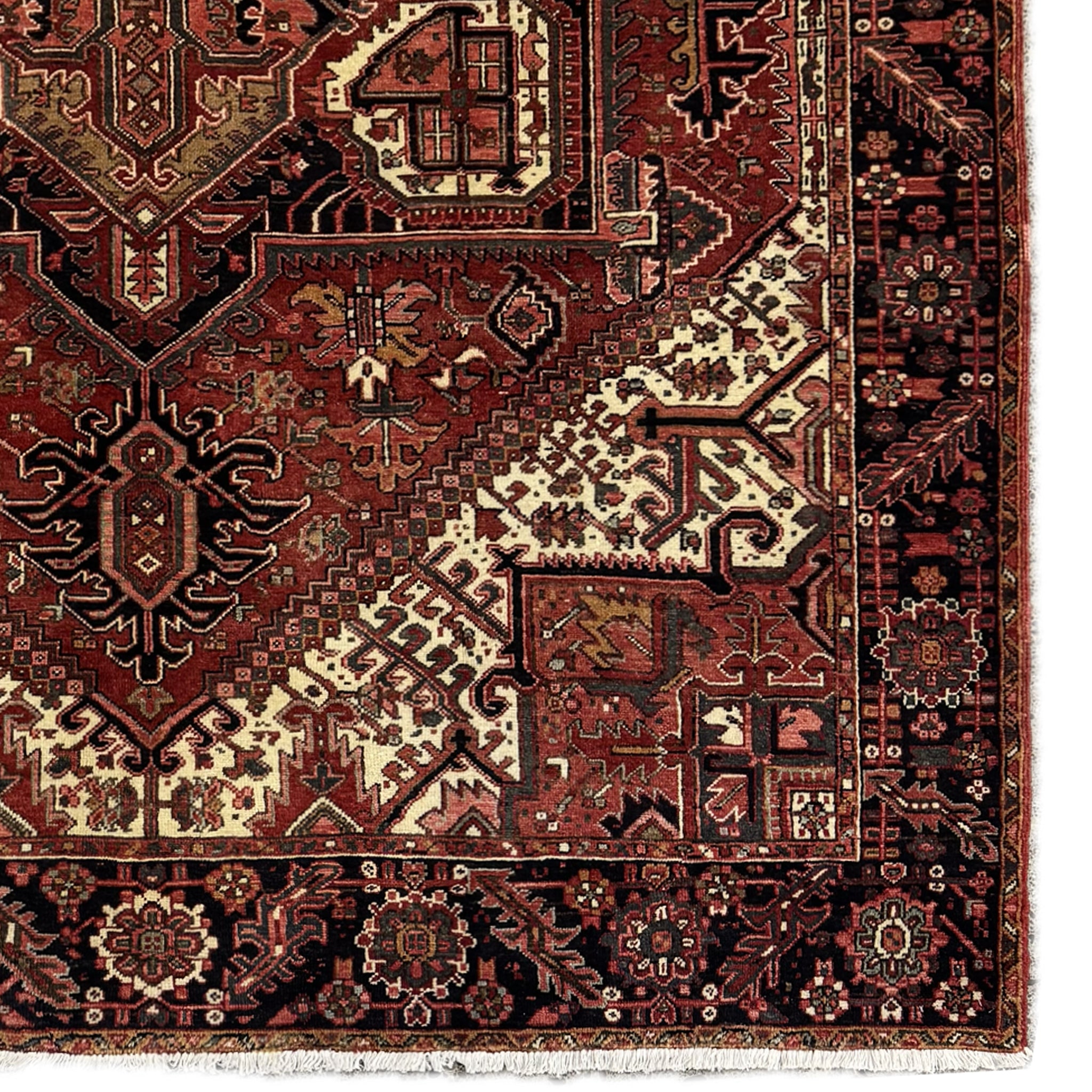 A hand-knotted Persian Heriz rug which is made in the Heriz region of northwest Iran. These rugs are highly valued for their durability, intricate designs and unique characteristics. They are crafted using traditional techniques, including hand knotting of wool onto a cotton or wool foundation.