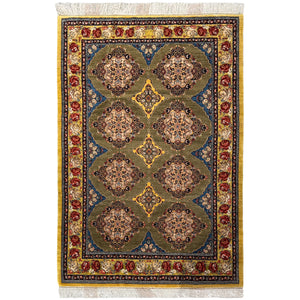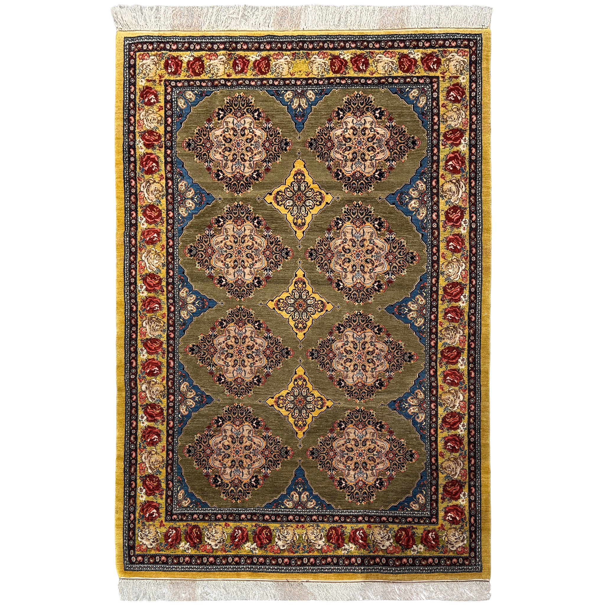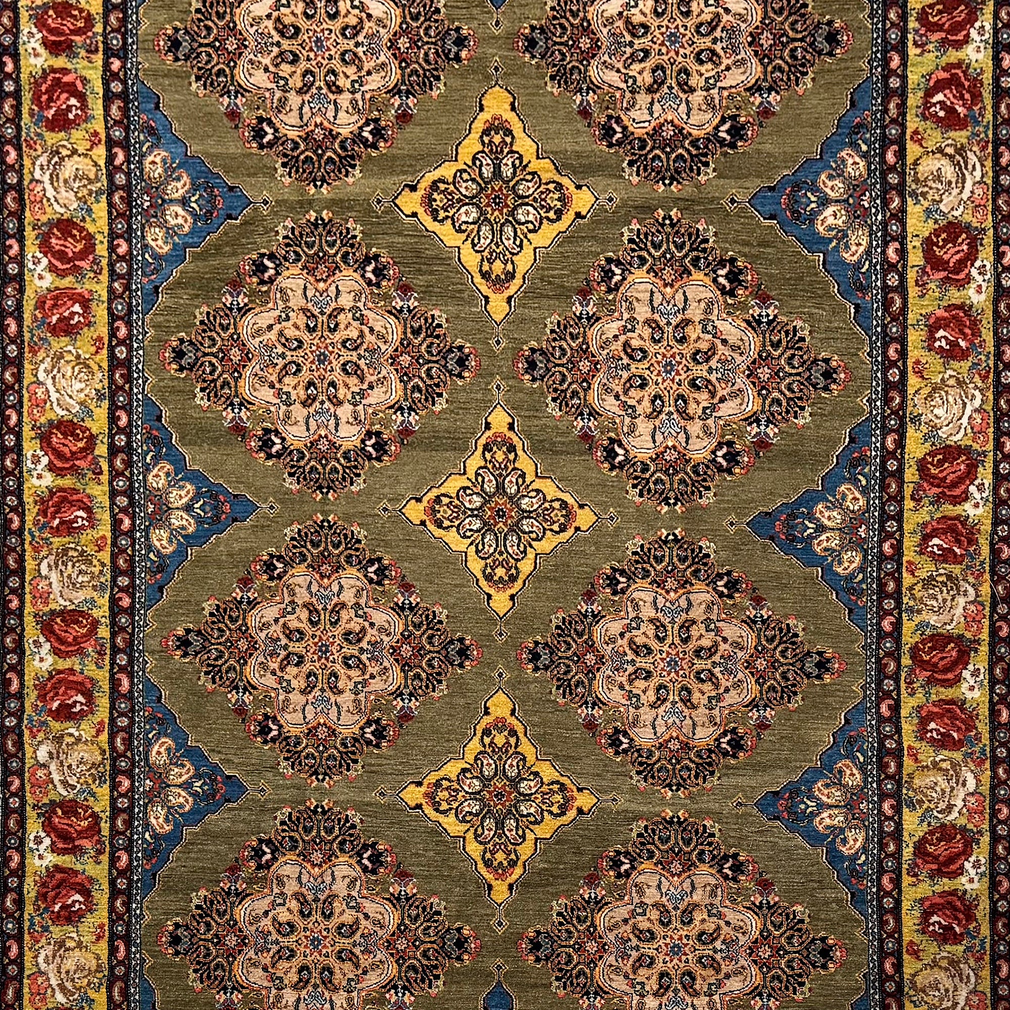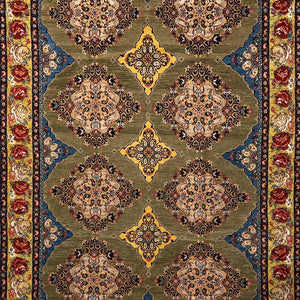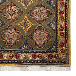 Handwoven in Sanandaj, Kurdestan, this elegant Persian rug showcases the refined craftsmanship the region is known for. The design features a harmonious all-over lattice of richly detailed diamond medallions set against a soft olive-green field, creating a balanced and rhythmic composition. Each medallion is filled with intricate floral motifs, reflecting the precision and artistry of Sanandaj weaving.