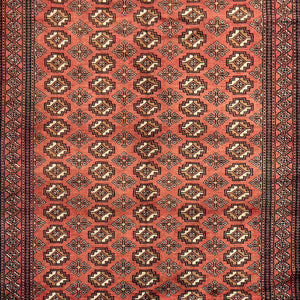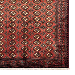 Hand-knotted from 100% high-quality wool, this Baluch rug comes from Iran’s Baluchestan region. Its warm rust field features intricate geometric and floral “gul” motifs in a symmetrical pattern, reflecting the region’s rich tribal weaving heritage. Elegant and timeless, it brings character, durability, and understated beauty to any interior.