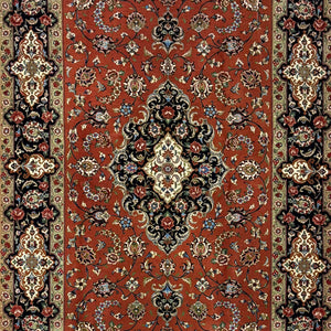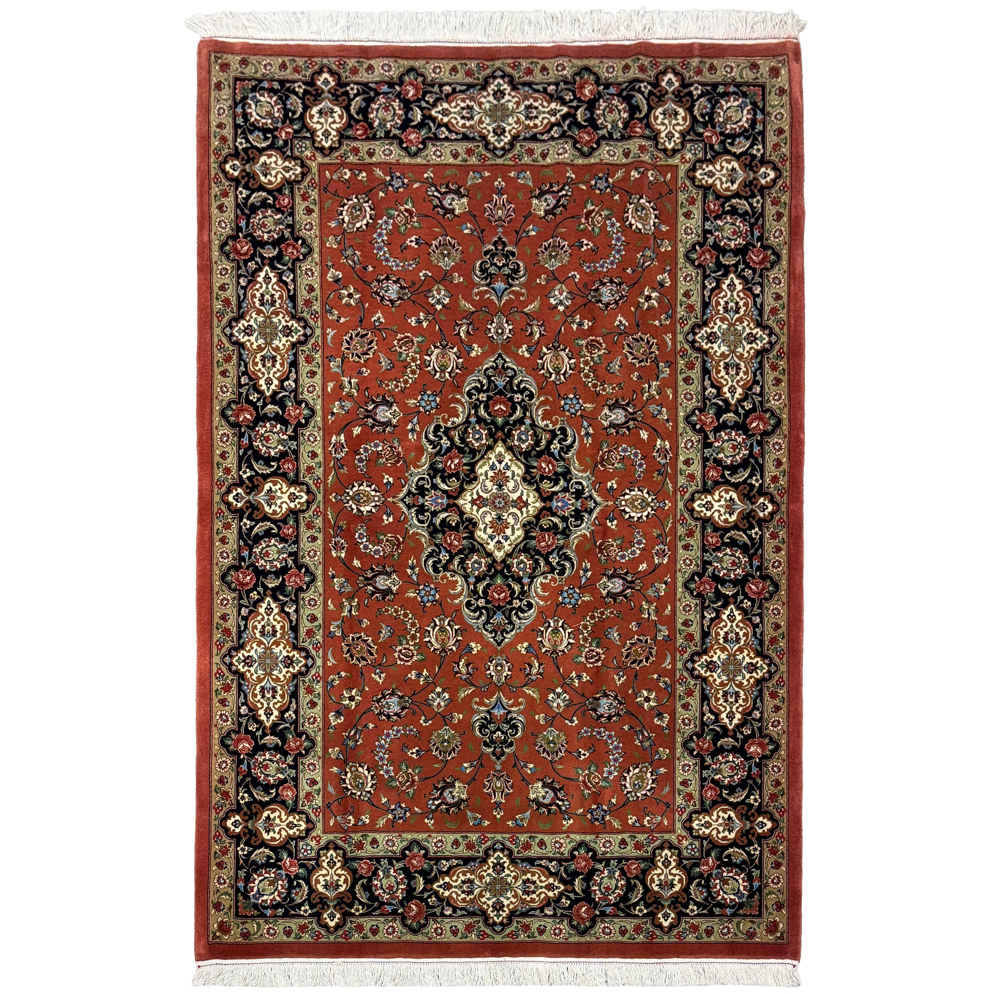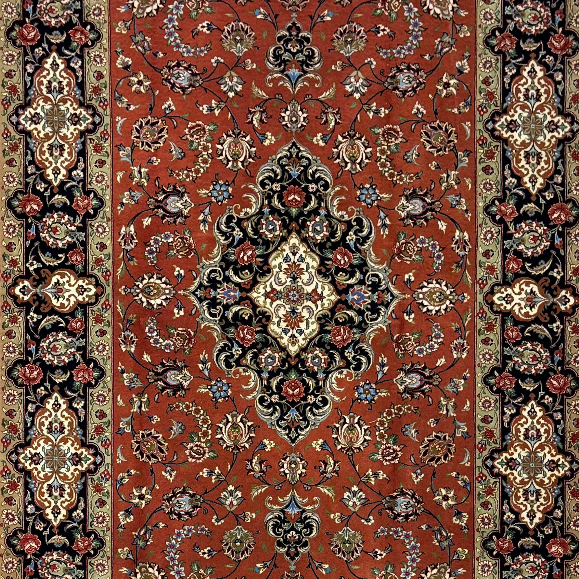 This beautiful Qum Persian rug is hand-knotted from fine lamb’s wool, with natural silk flowers woven into the floral motifs for a subtle, elegant shimmer. From Qum, a city in central Iran renowned for its luxurious rugs, it features a central medallion with teardrop motifs, surrounded by intricate floral patterns across the field. A midnight blue border with beige and midnight blue accents frames the design, while the natural silk highlights shimmer beautifully, adding depth and sophistication.