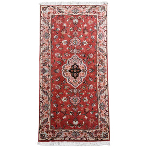 This beautiful small Persian Tabriz rug is finely hand-knotted with 50 Raj density, giving the pattern exceptional clarity. Crafted from soft lamb’s wool with natural silk highlights, it has a gentle sheen that enhances the intricacy of the design. Set on a blush field, the rug features a classic central medallion surrounded by traditional Shah Abbasi motifs, including lotus palmettes, floral sprays and scrolling arabesque vines. The detailed all over pattern reflects the precision and elegance for which Tabriz weavers are renowned.