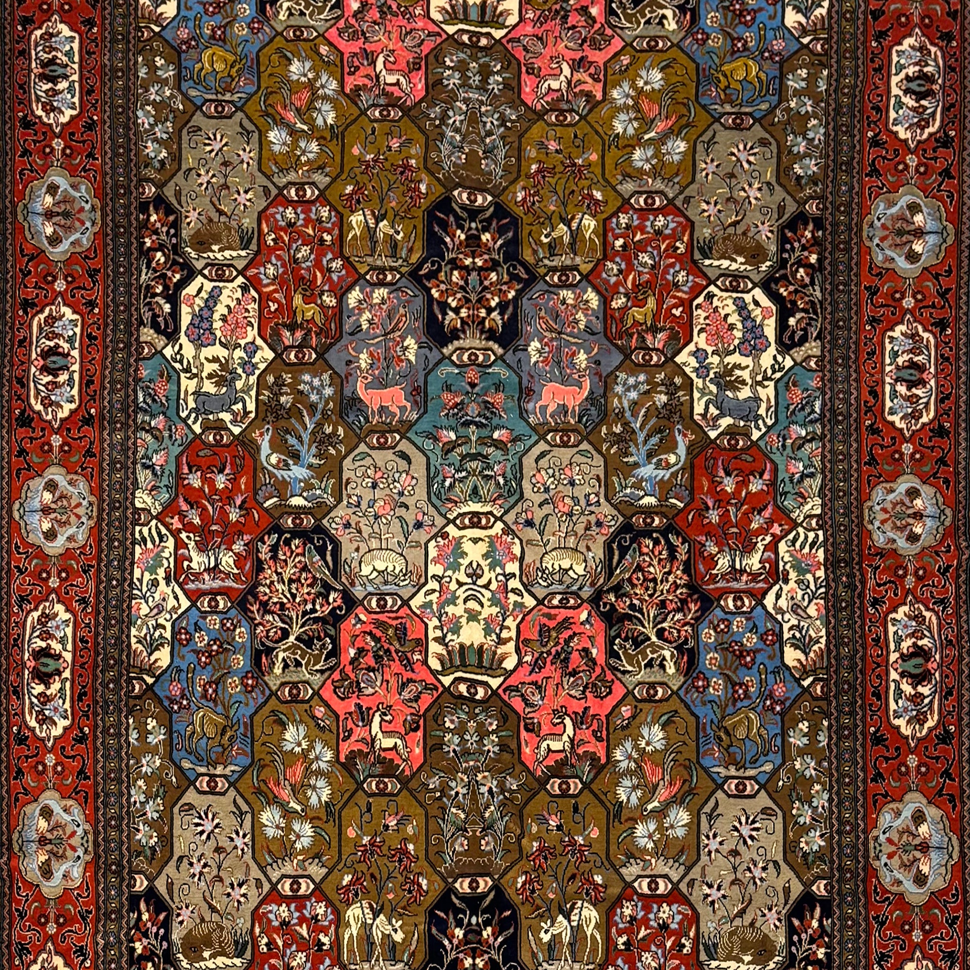 This handwoven Qum rug is a refined example of the exceptional craftsmanship for which the holy city of Qum is celebrated. Woven with a very fine knot density from high-quality lamb’s wool, it offers a soft, silky handle and outstanding clarity of detail. The field presents a pictorial garden "Bagh - Golestan" design, where floral elements, stylised trees, birds and animal motifs are arranged in a flowing, illustrative composition.