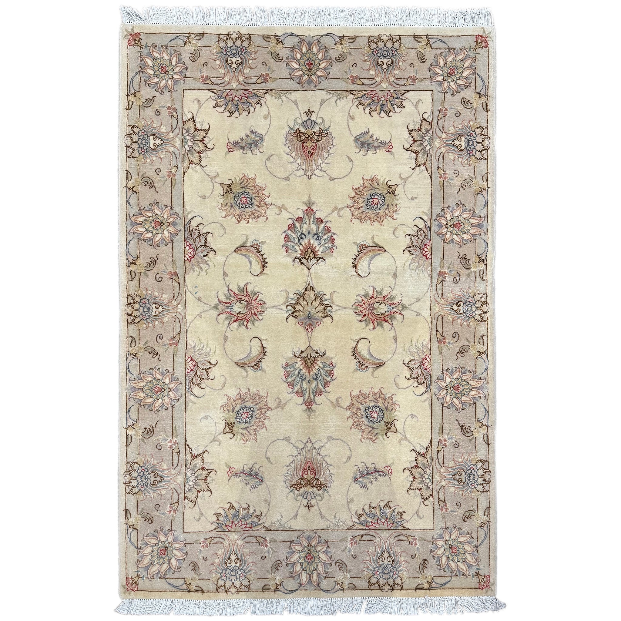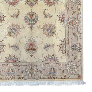 The cream field creates a soft serene backdrop, allowing the subtle palette of pastel tones to stand out beautifully without overpowering the space. Delicate floral forms, refined curves and balanced symmetry all reflect the traditional artistry Tabriz rugs are celebrated for. Luxurious yet understated, this piece combines durability with refined elegance, making it ideal for both contemporary and traditional interiors. A timeless example of Persian craftsmanship.