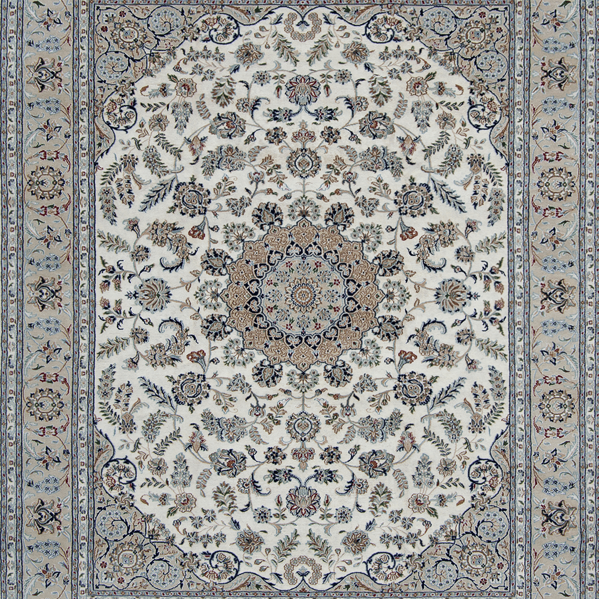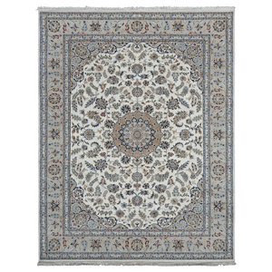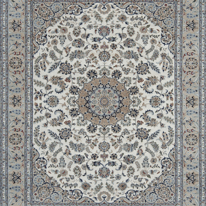 Classic central medallion with tear drops are placed on an 'islimi' field. The construction is quality wool hand knotted onto cotton warps and wefts. The silk highlights bring out the delicacy of the design. The basic colours used in Nain design rugs are blue and cream giving an illuminate and soft air to the rug. The silk highlights bring out the delicacy of the design.