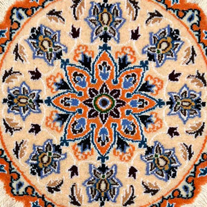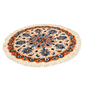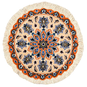This exquisite small Nain round rug is hand-knotted from fine wool in the historic city of Nain, near Isfahan in central Iran ( Persia )a region celebrated for its exceptional craftsmanship. Soft, durable and timeless in design.
