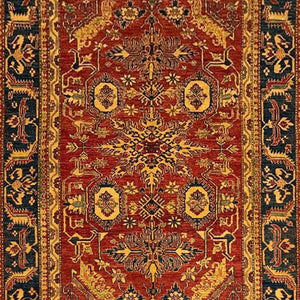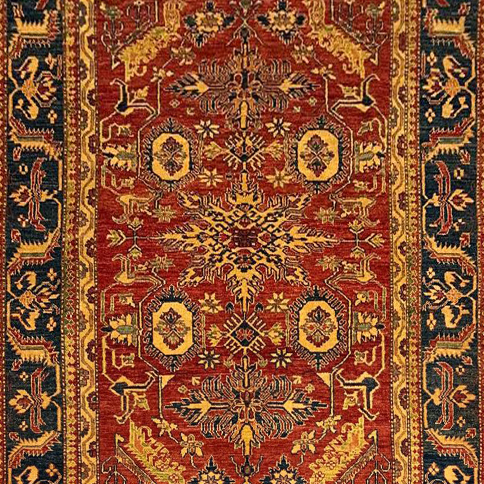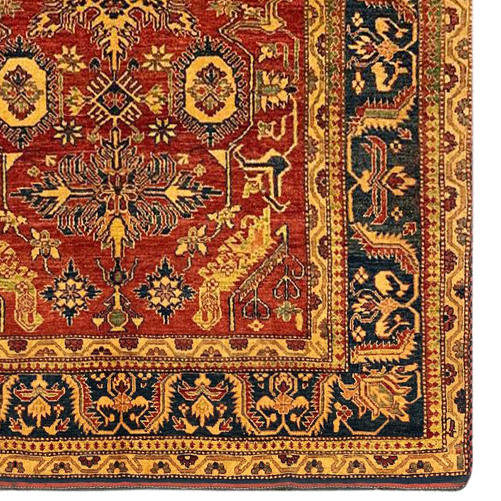 This hand-knotted Samarkand rug is a fine example of Central Asian craftsmanship. Made from natural wool, it features a deep brick-red field with geometric floral motifs in tones of gold, navy blue, and olive green, framed by a bold midnight-blue border.