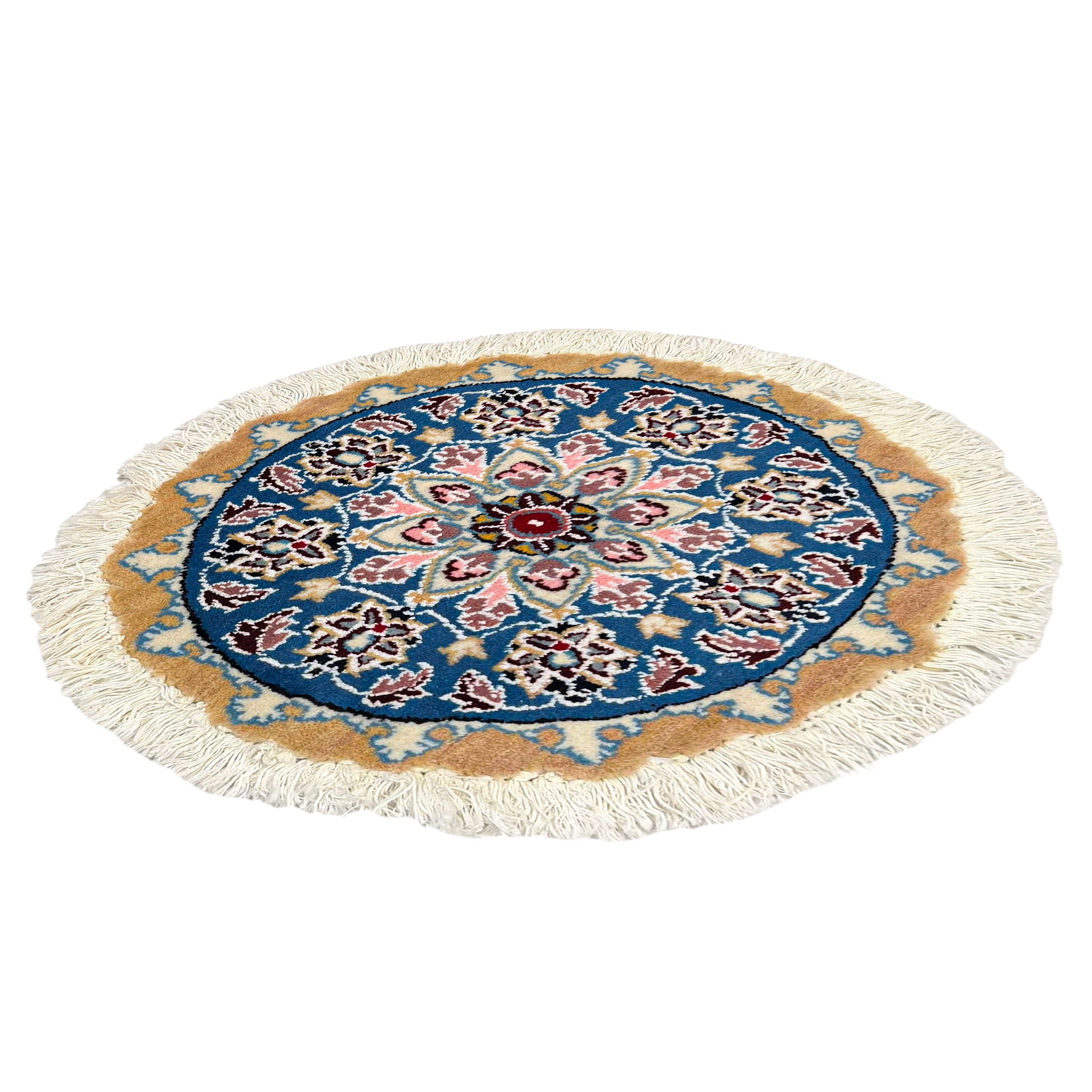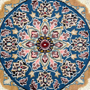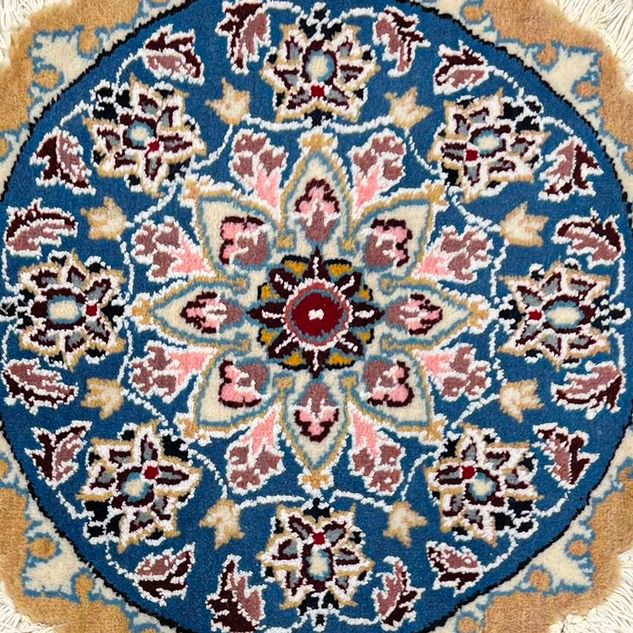 This exquisite small Nain round rug is hand-knotted from fine wool in the historic city of Nain, near Isfahan in central Iran ( Persia )a region celebrated for its exceptional craftsmanship. Soft, durable and timeless in design.