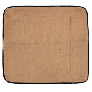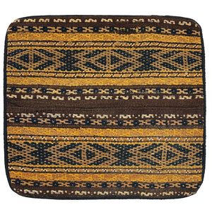 This pure wool Kilim cushion features earthy stripes in ochre, brown, black, and beige, with traditional geometric patterns. It’s finished with a durable cotton backing and a quality zipper for lasting use.
