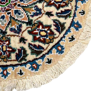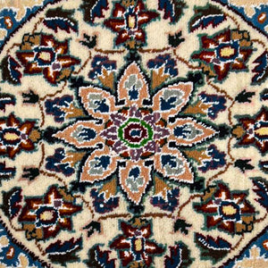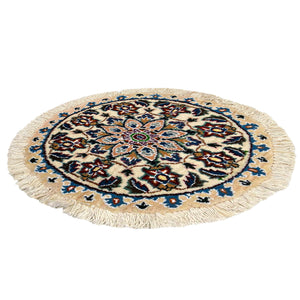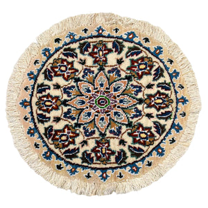 This exquisite small Nain round rug is hand-knotted from fine wool in the historic city of Nain, near Isfahan in central Iran ( Persia )a region celebrated for its exceptional craftsmanship. Soft, durable and timeless in design.
