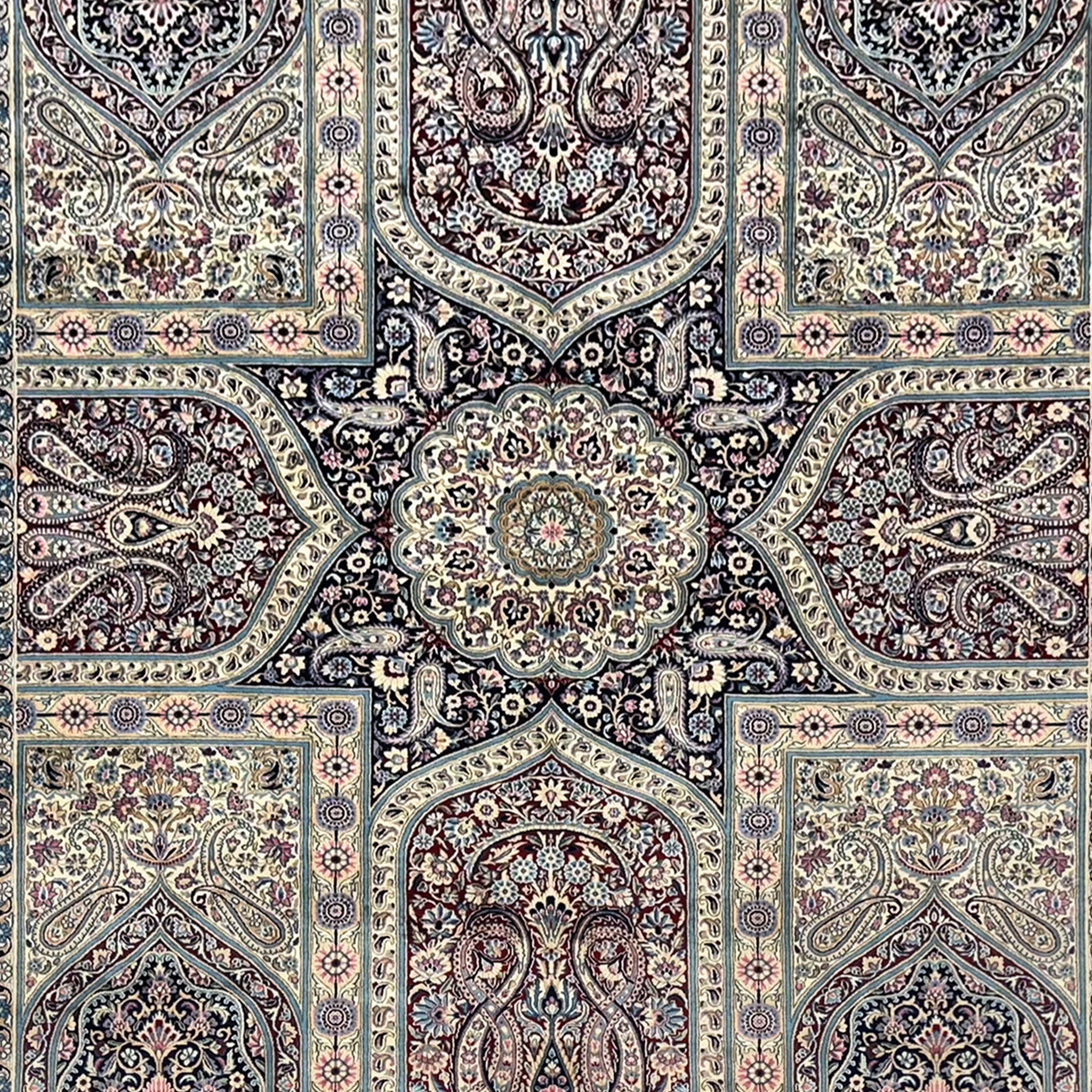 A striking central medallion anchors the design, surrounded by ornamental panels filled with delicate paisleys, blossoms, arabesques and flowing vines, all arranged in perfect symmetry. Multiple layered borders, detailed with floral motifs and rosettes, frame the composition elegantly.