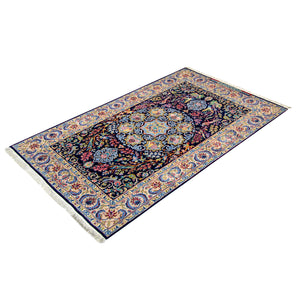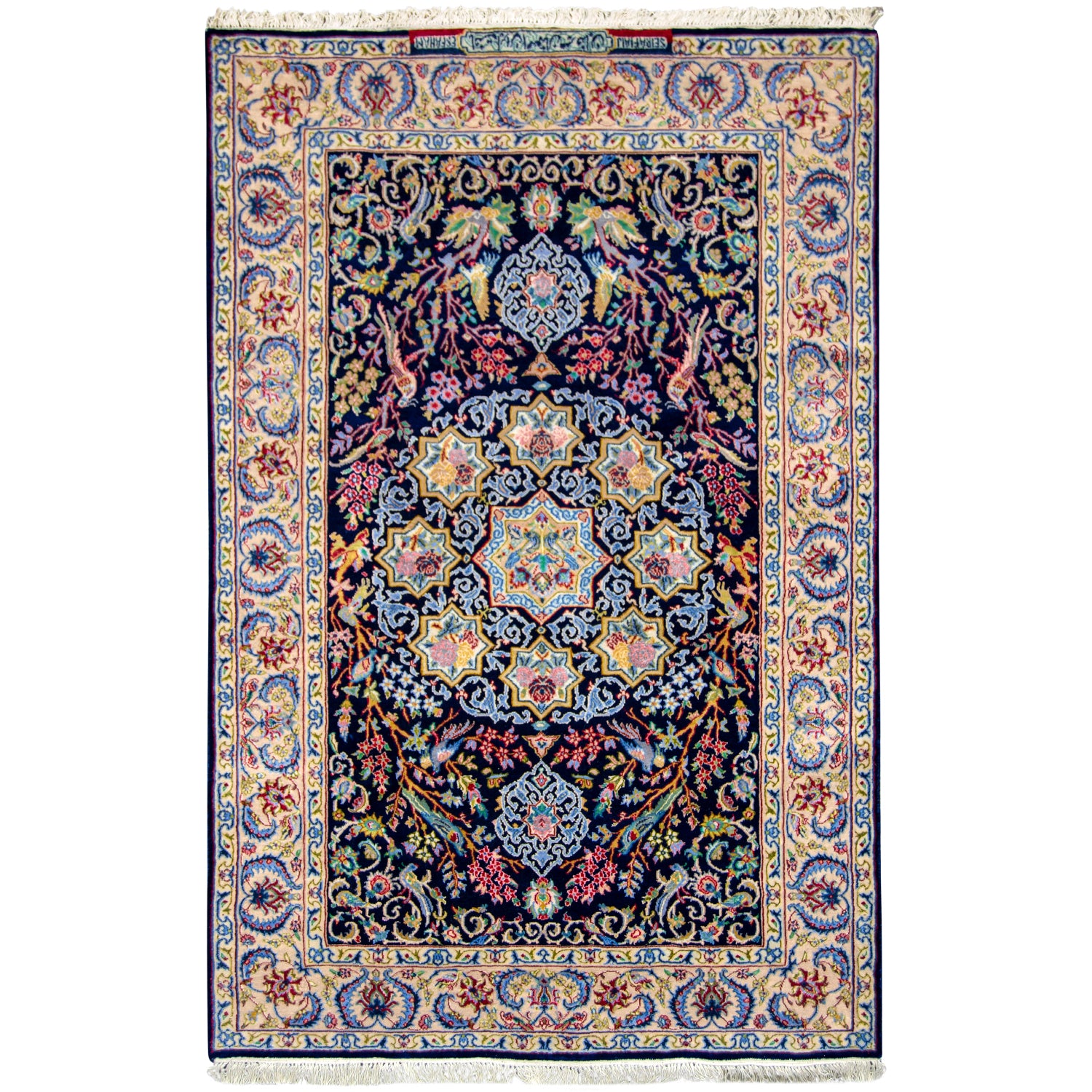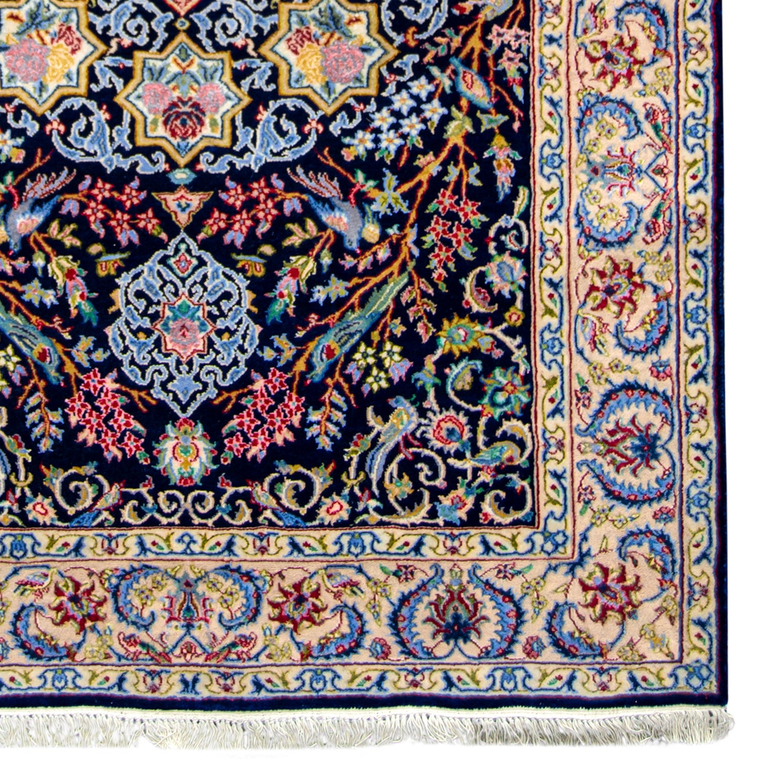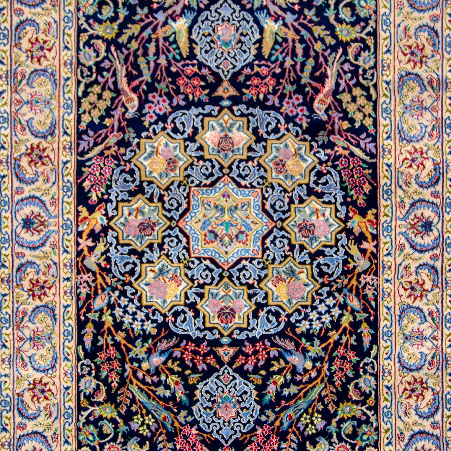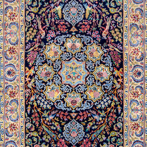 Woven wool rug with a deep navy field, beautifully framed by an ivory border. The design centres around a striking layered star medallion, surrounded by flowing vines, delicate florals, and graceful bird motifs that create movement and elegance throughout. Soft tones of sky blue, blush, warm gold, and gentle green provide luminous contrast against the rich background, adding depth while maintaining a balanced composition.