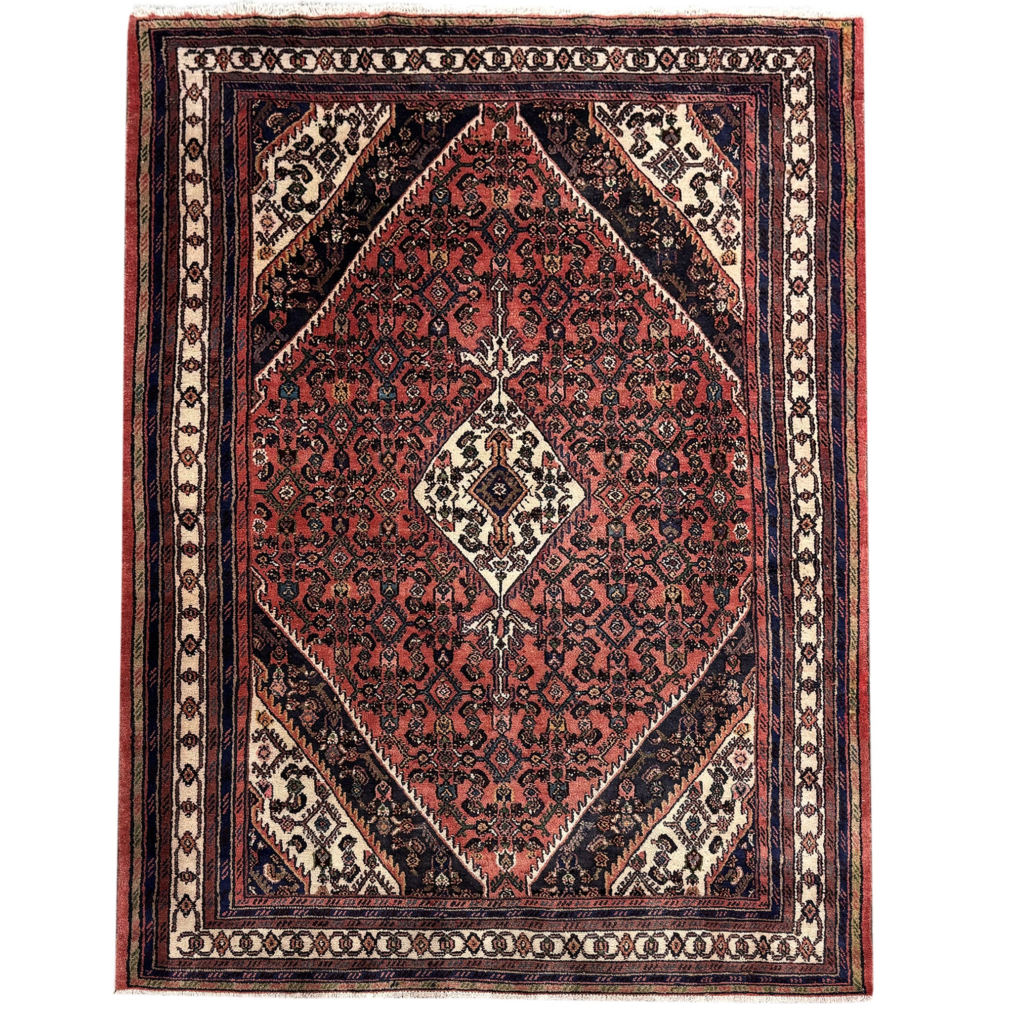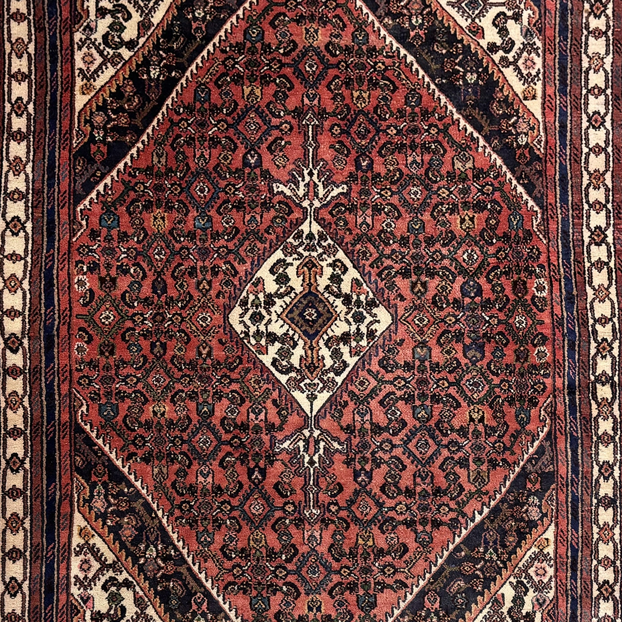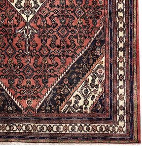 Hand-knotted Persian Hamadan wool rug featuring a refined Senneh design, crafted in western Iran. Made from high-quality wool on wool foundation, it offers a soft handle, resilience, and lasting character.