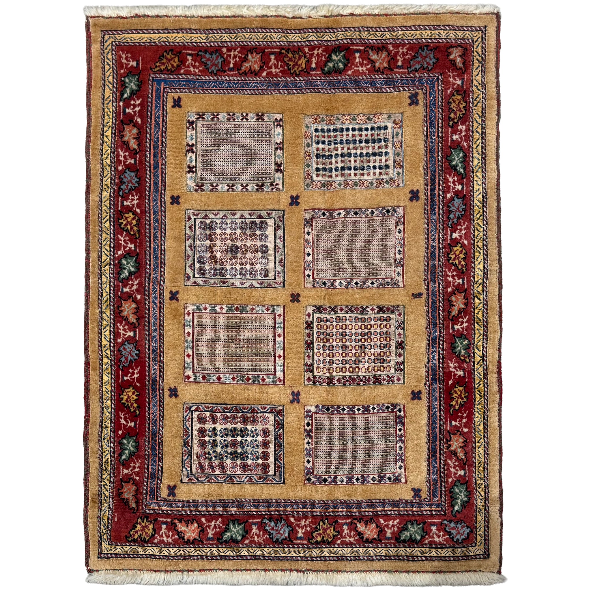 This beautiful piece comes from Sirjan, a historic weaving town in southern Iran known for its skilled artisans. It combines Kilim and pile rug techniques, blending the flatwoven texture of a kilim with the soft feel of a wool pile. Hand-knotted from fine-quality wool, it features the traditional “khesti” design, with each section decorated in intricate geometric and floral motifs. The warm camel and terracotta shades, framed by a deep red border with stylised leaf patterns, create a look that feels both rich and balanced. Timeless and durable, this rug reflects the true artistry of Sirjan’s weaving tradition.